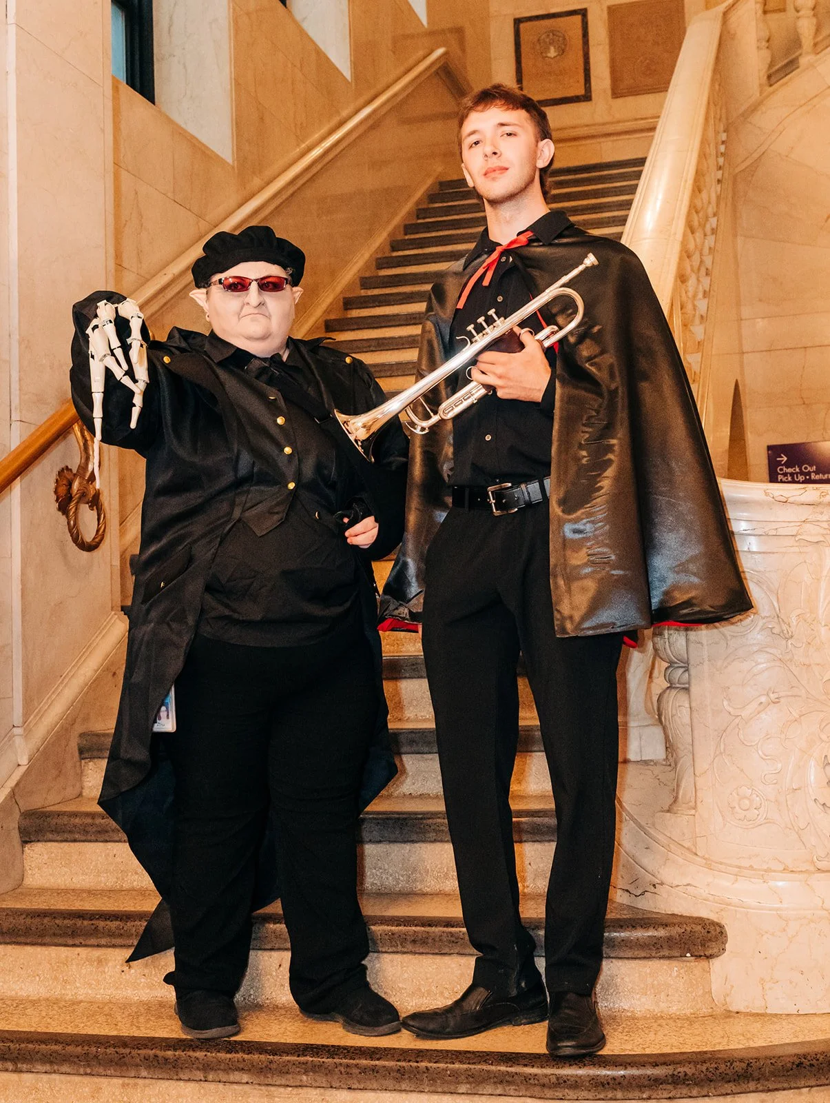 Two people dressed in black costumes, posing on a staircase. One is holding a trumpet and wearing a skeleton glove, sunglasses, and a hat. The other is taller, holding a trumpet, wearing a cape and with a confident expression.