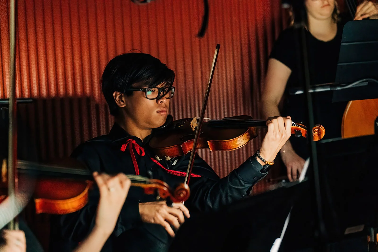 Orchestra performing on stage with an audience watching in a dimly lit concert hall.