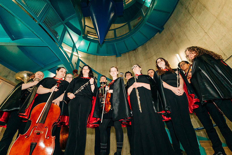 A group of musicians dressed in black and red robes, holding various musical instruments, standing in a modern, circular building with a concrete wall and blue staircase overhead.